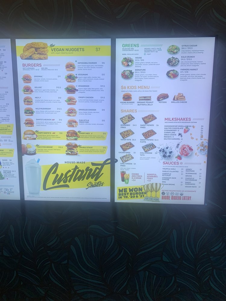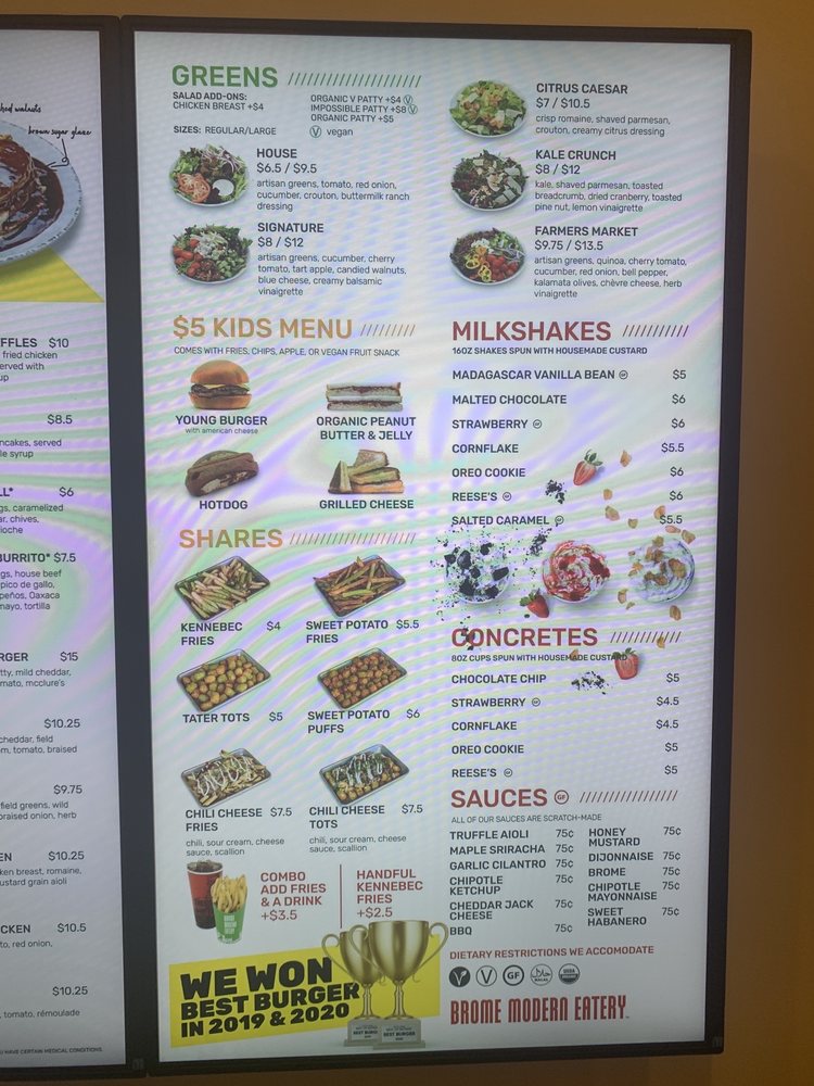 Welcome to Brome Modern Eatery, where new American cuisine meets a modern twist on classic flavors. Located at 22062 Michigan Ave in Dearborn, MI, Brome is an inviting space that balances a trendy ambiance with casual comfort. The menu boasts an impressive selection of gourmet burgers, complemented by mouthwatering milkshakes, including the irresistible Cornflake Shake and rich Reese's Shake, each priced around $6.